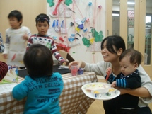 年長組の子どもたちが時間をかけて少しずつ作っていた、手作りのごちそうをお店屋さんにしてみんなを招待してくれました。いちご・りんご組の小さな子どもたちは、目を輝かせながら、本物そっくりの食べ物に触れていました。幼稚園のA組さんにも声をかけ、お客さんで来てもらいました。威勢のよい声がきこえていました。
